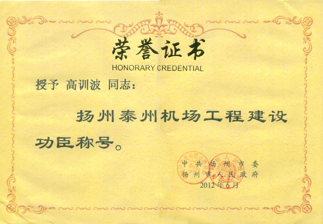 熱烈祝賀高訓波同志喜獲“揚州泰州機場建設功臣”榮譽稱號